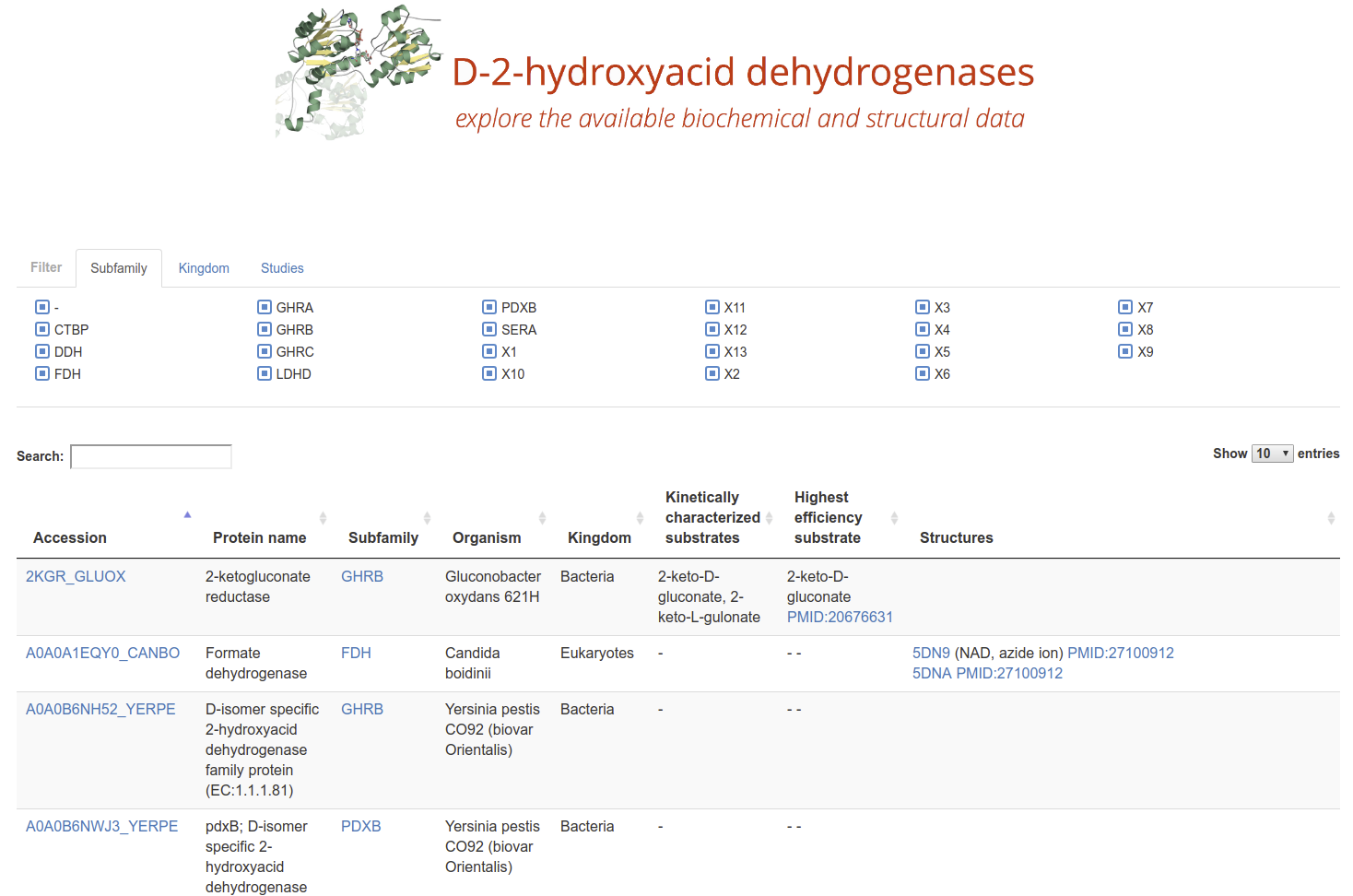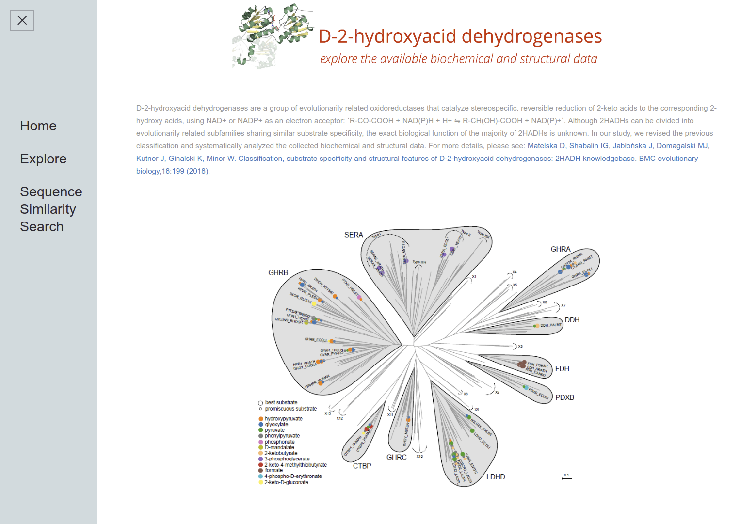 The D-isomer specific 2-hydroxyacid dehydrogenases (2HADHs) comprise a diverse family of oxidoreductases with various metabolic roles and biotechnological applications. The complex evolution and broad sequence diversity of this family hinder functional annotations for uncharacterized members. To simplify 2HADHs classification, we have created a 2HADH knowledgebase that consists of three elements: an explorable phylogenetic tree of the family, an interactive table with annotations of the selected enzymes, and a BLAST search tool.