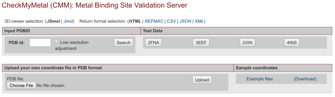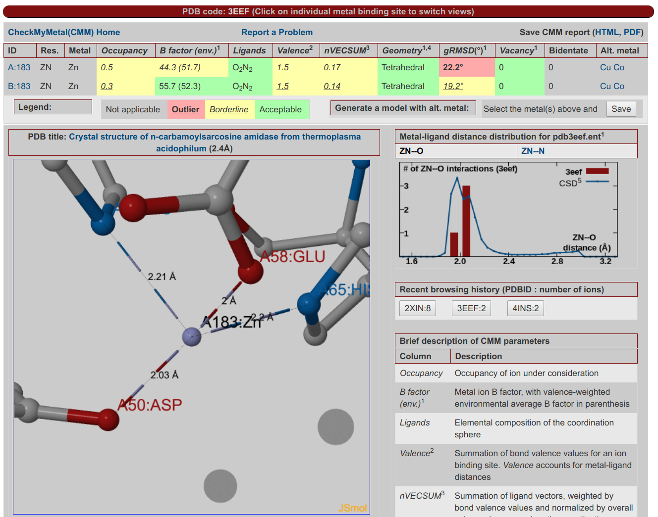 CheckMyMetal (CMM) is a validation tool for metals bound to macromolecules. The validation parameters that CMM examines cover the entire binding environment of the metal ion, including the position, charge and type of atoms and residues surrounding the metal. CMM can detect discrepancies from target values of the parameters that it assesses, and highlight potential problems in metal assignment and modeling. Hence, CMM is a convenient validation tool that is complementary to existing experimental methods for metal identification in macromolecular structures. CheckMyMetal can evaluate user submitted structures and has pre-calculated results for structures in the PDB.