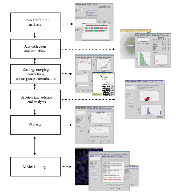 The HKL-3000 software suite provides a seamless path from raw X-ray diffraction images to a refined structural model. It combines the data collection and reduction functions of HKL-2000 with tools for data analysis, substructure solution, phasing, and model building for macromolecular crystallography. It merges different crystallographic software into a complete structure solution pipeline for both SAD/MAD and molecular replacement (MR) phasing.