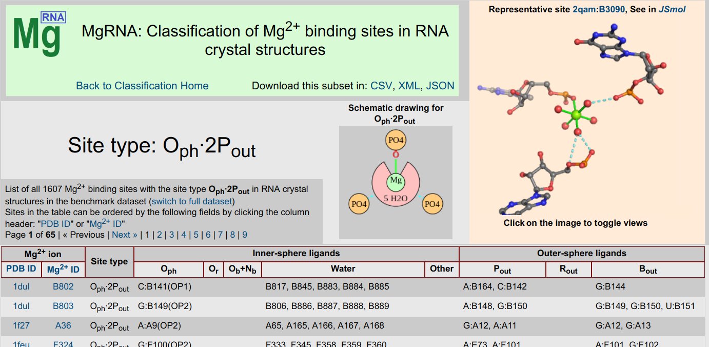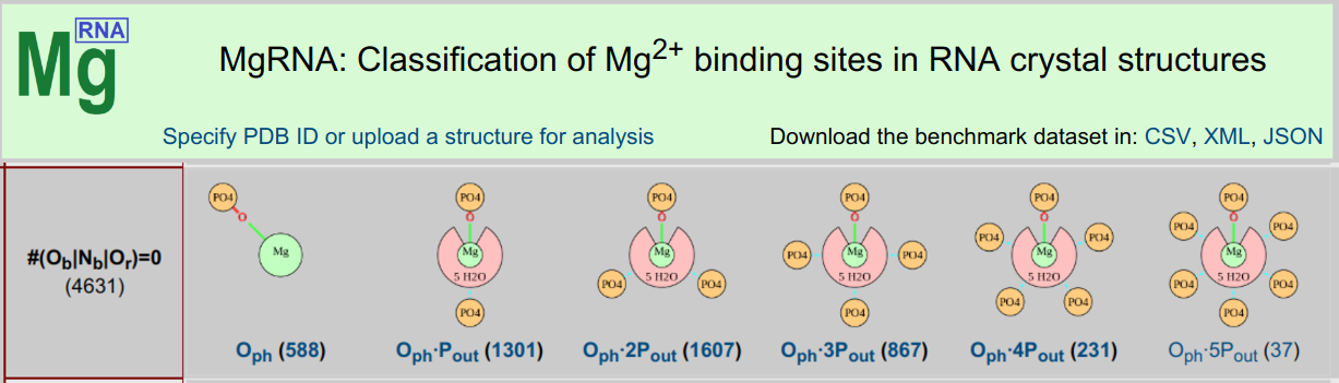 MgRNA provides a classification scheme for Mg2+ binding sites in RNA. After a thorough analysis of the Mg2+/RNA structures in the PDB, discrete motifs of Mg2+ binding were identified. The server can be used to analyze user-submitted structures and has pre-calculated results for structures in the PDB.